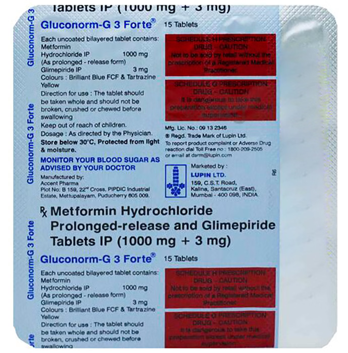 GlUcOnorm-G 3 Forte Tablet PR belongs to a category of medicines known as anti-diabetic drugs. It is a combination of two medicines used to treat type 2 diabetes mellitus in adults. It helps control blood sugar levels in people with diabetes. GlUcOnorm-G 3 Forte Tablet PR should be taken with food. Take it regularly at the same time each day to get the most benefit. Your doctor will decide what dose is best for you, and this may change from time to time according to how it is working, according to your blood sugar levels. Keep taking this medicine, even if you feel well or your blood sugar levels are controlled. If you stop it without consulting your doctor, your blood sugar levels could rise and put you at risk of kidney damage, blindness, nerve problems, and loss of limbs. Remember that it is only part of a treatment program that should also include a healthy diet, regular exercise, and weight reduction as advised by your doctor. Your lifestyle plays a big part in controlling diabetes. The most common side effect of GlUcOnorm-G 3 Forte Tablet PR is low blood glucose levels (hypoglycemia). Make sure you recognize the signs of having low blood glucose levels, such as sweating, dizziness, headache, and shaking, and know how to deal with them. To prevent this, it’s important to have regular meals and always carry a fast-acting source of glucose, such as sugary food or fruit juice, with you. Drinking alcohol can also increase your risk of low blood sugar levels and should be avoided. Other side effects that may be seen on taking this medicine include taste changes, nausea, diarrhea, stomach pain, headache, and upper respiratory tract infection. Some people may find that they put on weight with this medicine. You should not take it if you have type 1 diabetes mellitus, diabetic ketoacidosis (high levels of acid in your blood), or severe kidney or liver disease. Before taking this medicine, tell your doctor if you have ever had heart disease. It may not be suitable. Pregnant or breastfeeding women should also consult their doctor before taking it. Your blood sugar levels should be checked regularly, and your doctor may also advise blood tests to monitor your blood cell counts and liver function.