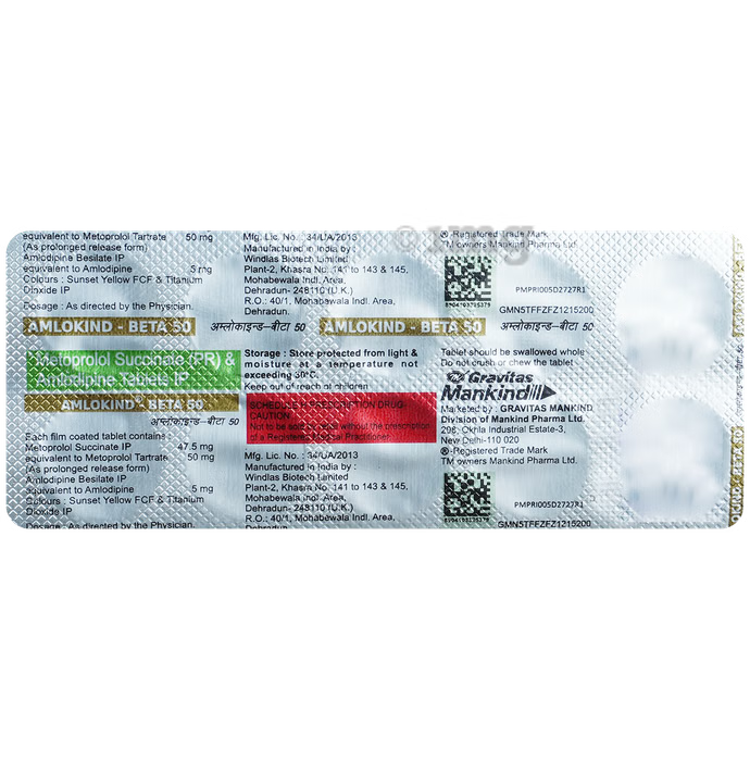 Amlokind-Beta 50 Tablet PR contains two medicines, both of which help to control high blood pressure and heart rate. It is also used for heart-related chest pain (angina), abnormal heart rhythms and chronic (long-term) heart failure.