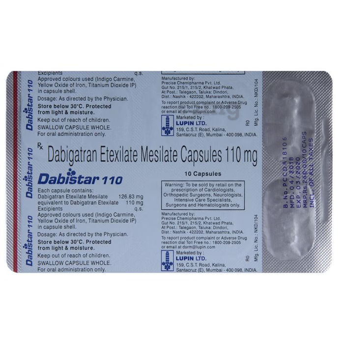 DABIstar 110 Capsule is an anticoagulant or blood thinner. It helps prevent and treat blood clots. It is used to reduce the risk of stroke and heart attack. It prevents and treats clot formation in the veins of your legs, lungs, brain, and heart.