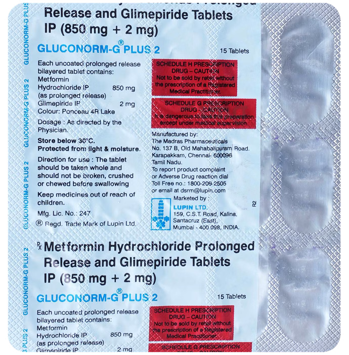 GlUcOnorm-G Plus 2 Tablet PR belongs to a category of medicines known as anti-diabetic drugs. It is a combination of two medicines used to treat type 2 diabetes mellitus in adults. It helps control blood sugar levels in people with diabetes. GlUcOnorm-G Plus 2 Tablet PR should be taken with food. Take it regularly at the same time each day to get the most benefit. Your doctor will decide what dose is best for you, and this may change from time to time according to how it is working, according to your blood sugar levels. Keep taking this medicine, even if you feel well or your blood sugar levels are controlled. If you stop it without consulting your doctor, your blood sugar levels could rise and put you at risk of kidney damage, blindness, nerve problems, and loss of limbs. Remember that it is only part of a treatment program that should also include a healthy diet, regular exercise, and weight reduction as advised by your doctor. Your lifestyle plays a big part in controlling diabetes. The most common side effect of GlUcOnorm-G Plus 2 Tablet PR is low blood glucose levels (hypoglycemia). Make sure you recognize the signs of having low blood glucose levels, such as sweating, dizziness, headache, and shaking, and know how to deal with them. To prevent this, it’s important to have regular meals and always carry a fast-acting source of glucose, such as sugary food or fruit juice, with you. Drinking alcohol can also increase your risk of low blood sugar levels and should be avoided. Other side effects that may be seen on taking this medicine include taste changes, nausea, diarrhea, stomach pain, headache, and upper respiratory tract infection. Some people may find that they put on weight with this medicine. You should not take it if you have type 1 diabetes mellitus, diabetic ketoacidosis (high levels of acid in your blood), or severe kidney or liver disease. Before taking this medicine, tell your doctor if you have ever had heart disease. It may not be suitable. Pregnant or breastfeeding women should also consult their doctor before taking it. Your blood sugar levels should be checked regularly, and your doctor may also advise blood tests to monitor your blood cell counts and liver function.